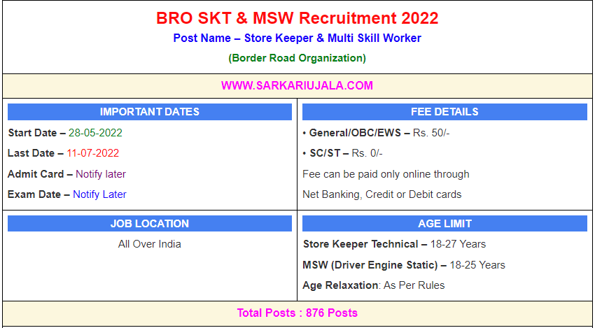 Post Description –BRO Border Road Organization is inviting Offline applications for Multi Skill Worker & Store Keeper for 876 posts. Interested people meet all the eligibility criteria, apply online Details Of Recruitment Of BRO SKT & MSW Recruitment 2022Posts Name – Store Keeper Technical & Multi Skill Worker Number Of Posts– 876 Posts Category Wise Posts – Store Keeper Technical – 377 Posts General- 157 Posts OBC- 103 Posts EWS- 38 Posts SC- 53 Posts ST- 26 Posts Multi Skilled Worker – 499 Posts General- 164 Posts OBC- 177 Posts EWS- 18 Posts SC- 90 Posts ST- 50 Posts Pay Scale – As Per Rules Education Qualification – Store Keeper Technical – 10th Passed & Store Keeping Knowledge/ Course Multi Skilled Worker – 10th Passed & Relevant Certificate How to Apply Online BRO SKT & MSW Recruitment 2022 – Candidates can apply through Offline provided below Address of the Border Road Organization before 11/July/2022. Send Application Form To – “Commandant GREF Centre, Dighi camp, Pune- 411015” Format For Envelope- APPLICATION FOR THE POST OF ____________ Category UR/SC/ST/OBC/EWSs/ESM/CPL, WEIGHTAGE PERCENTAGE IN ESSENTIAL QUALIFICATION ________________________ on the top of the envelope . Required Documents For Online Application – Educational Mark sheet And Certificates Aadhar Card / Pan Card Passport Size Photo Signature Selection Mode – Written Examination PET/PST Medical Test Final Merit List