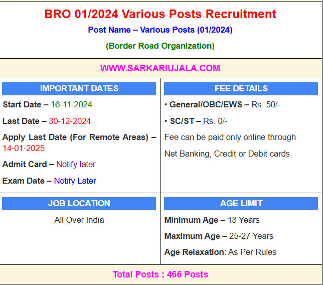Post Description – BRO Border Road Organization is inviting Offline applications for Various Posts for 466 posts. Interested people meet all the eligibility criteria, apply online Details Of Recruitment Of BRO 01/2024 Various Post Offline FormPosts Name – Various Posts Number Of Posts– 466 Posts Category Wise Posts – General- 226 Posts OBC- 81 Posts EWS- 53 Posts SC- 67 Posts ST- 39 Posts Trade Wise Posts – Draughtsman – 16 Posts Supervisor- 02 Posts Turner- 10 Posts Machinist- 01 Posts Driver Mechanical Transport- 417 Posts Driver Road Roller – 04 Posts Operator Excavating Machinery – 36 Posts Pay Scale – As Per Rules Education Qualification – Draftsman- 10+2 with Science And 2-year Certificate in Architecture/Draughtsmanship or National Trade Certificate in Draughtsman (Civil) And 1 year experience Supervisor Administration- Degree And NCC ‘B’ Certificate or Ex-Naib Subedar equivalent Turner- Turner Certificate from ITI/CTI/NCVT/Defence Trade Certificate And 1 year experience Machinist- 10th Passed And Machinist Certificate or Defence Trade Certificate And 1 year experience Driver Mechanical Transport (Ordinary Grade)- 10th Passed And Heavy Motor Vehicle driving license Driver Road & Roller Operator (Ordinary Grade)- 10th Passed And Heavy Motor Vehicle/Road Roller driving license And 6 months experience Operator Excavating Machinery- 10th Passed And Heavy Motor Vehicle driving license or Dozer/Excavator license And 6 months experience Note- : Must Read Official Notification For Full Eligibility Details . How to Apply Online BRO Various Posts 01/2024 Recruitment – Candidates can apply through Offline provided below Address of the Border Road Organization before 30/December/2024. Send Application Form To – “Commandant GREF Centre, Dighi camp, Pune- 411015” Format For Envelope- APPLICATION FOR THE POST OF ____________ Category UR/SC/ST/OBC/EWSs/ESM/CPL, WEIGHTAGE PERCENTAGE IN ESSENTIAL QUALIFICATION ________________________ on the top of the envelope . Required Documents For Online Application – Educational Mark sheet And Certificates Aadhar Card / Pan Card Passport Size Photo Signature Selection Mode – Written Exam PET/PST Medical Test Final Merit List