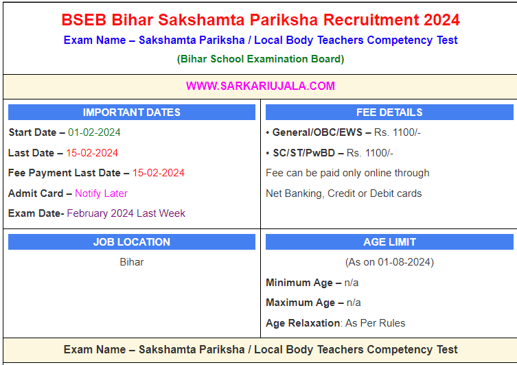 BSEB Bihar Sakshamta Pariksha Recruitment 2024Exam Name – Sakshamta Pariksha / Local Body Teachers Competency Test(Bihar School Examination Board) | |||||