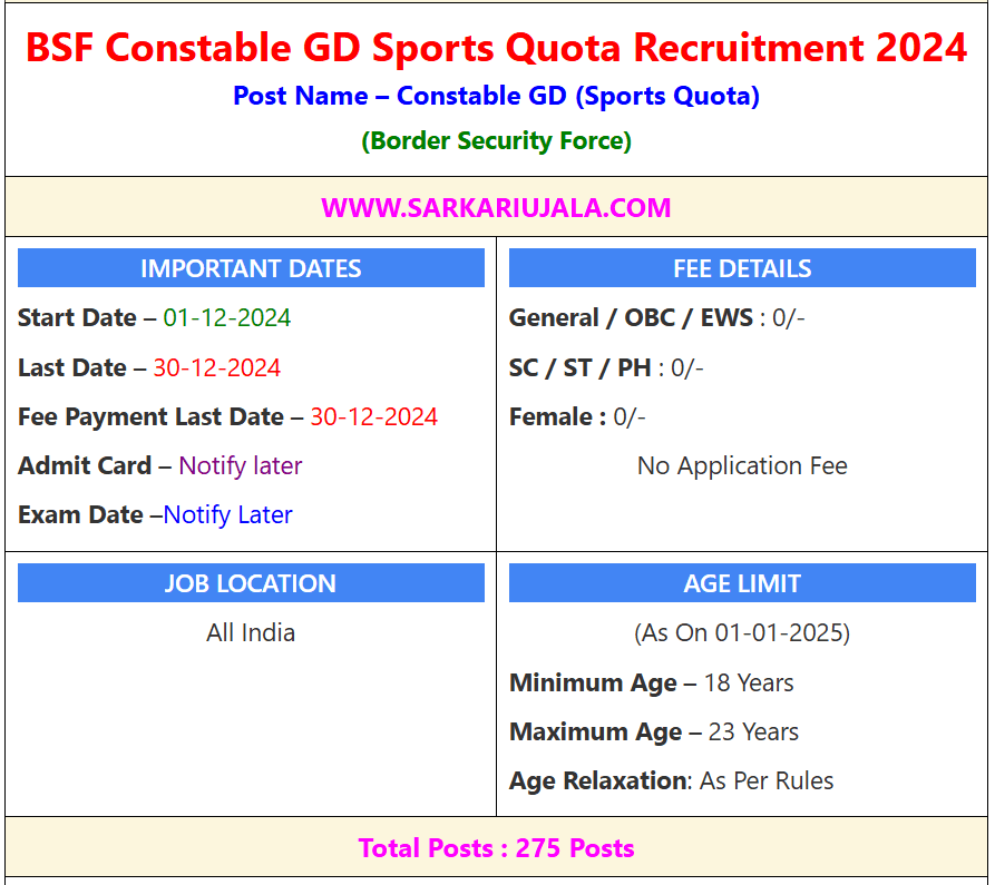Post Description – The Border Security Force (BSF) has announced the recruitment for Constable GD (Sports Quota) positions in 2024. The application process starts on December 1, 2024, and ends on December 30, 2024. The last date to pay the application fee is also December 30, 2024. There is no application fee for any category, including General, OBC, EWS, SC, ST, PH, and Female candidates. The job location is across India. Candidates must be between 18 and 23 years old as of January 1, 2025, with age relaxation as per rules. There are a total of 275 posts available. The admit card and exam date will be notified later. For more details, visit SarkariUjala.Com Details Of Recruitment Of BSF Constable GD Sports Quota Online Form 2024Posts Name –BSF Constable (General Duty) Sports Number Of Posts – 275 Posts Category Wise Posts – Constable (GD) Men– 127 Posts Constable (GD) Women – 148 Posts Pay Scale – As Per Rules Education Qualification – 10th Passed From Any Board And Sports Players Who Have Participated or Won Medal in the Various Level of Competition. Physical Standard Height: 170 cm (Male), 157Cm (Female) Chest : 80cm – 85 Cm How to Apply Online BSF Constable GD Sports Quota Online Form 2024 – Candidates can apply through link provided below or they can also apply through official site of the Border Security Force Before 30 December 2024 . Required Documents For Online Application – Educational Mark sheet And Certificates Aadhar Card / Pan Card Passport Size Photo Signature Selection Mode – Written Exam PET/PST Merit List