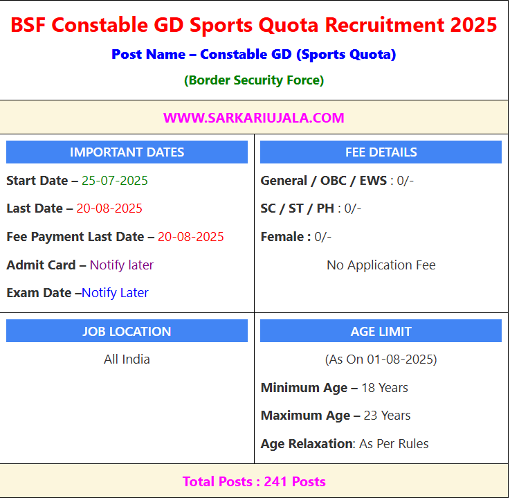 Post Description – The Border Security Force (BSF) has released the online application form for 241 Constable posts under the Sports Quota. Eligible candidates can apply online through the link given below or by visiting the official website. Details Of Recruitment Of BSF Constable GD Sports Quota Online Form 2025Posts Name –BSF Constable (General Duty) Sports Number Of Posts – 241 Posts Category Wise Posts – Constable (GD) Men– 128 Posts Constable (GD) Women – 113 Posts Pay Scale – As Per Rules Education Qualification – 10th Passed From Any Board And Sports Players Who Have Participated or Won Medal in the Various Level of Competition. Physical Standard Height: 170 cm (Male), 157Cm (Female) Chest : 80cm – 85 Cm How to Apply Online BSF Constable GD Sports Quota Online Form 2025 – Candidates can apply through link provided below or they can also apply through official site of the Border Security Force Before 20 August 2025 . Required Documents For Online Application – Educational Mark sheet And Certificates Aadhar Card / Pan Card Passport Size Photo Signature Selection Mode – Written Exam PET/PST Merit List