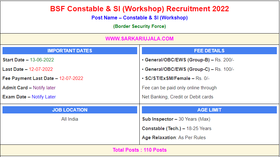 Post Description –BSF Border Security Force is inviting online applications for Constable & SI (Workshop) for 110 posts. Interested people meet all the eligibility criteria, apply online Details Of Recruitment Of BSF Constable & SI Online Form 2022Posts Name – Constable & SI (Workshop) Number Of Posts – 110 Posts Category Wise Posts – Sub Inspector (SI) – 22 Posts General – 07 Posts OBC – 06 Posts SC – 05 Posts ST – 01 Posts EWS – 03 Posts Constable (Technical) – 88 Posts General – 43 Posts OBC – 17 Posts SC – 09 Posts ST – 08 Posts EWS – 11 Posts Pay Scale – As Per Rules Education Qualification – Sub Inspector (SI) – 03 Years Diploma In Mechanical /Automobile Engineer Constable (Technical)- 10th Passed & ITI & 3 Years Experience Physical Standard Height & Chest For General/OBC/SC Height: 165 cm (Male), 157Cm (Female) Chest : 75cm -80 Cm Height & Chest For ST– Height: 162.5 cm (Male), 150Cm (Female) Chest – 73cm – 75 cm Running- 3.2 KM in 17 Minute (Male) , 1.6 KM in 9 Minute (Female) How to Apply Online BSF Constable & SI Online Form 2022 – Candidates can apply through link provided below or they can also apply through official site of the Border Security Force before 12/July/2022. Required Documents For Online Application – Educational Mark sheet And Certificates Aadhar Card / Pan Card Passport Size Photo Signature Selection Mode – Written Examination PET/PST Final Merit List