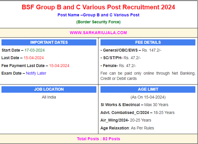 Post Description – BSF Border Security Force is inviting online applications for Group B & Group C Various Post for 82 posts. Interested people meet all the eligibility criteria, apply online Details Of Recruitment Of BSF Group B and C Various Post Online Form 2024Posts Name – Group B & Group C Number Of Posts – 82 Posts Category Wise Posts – Sub Inspector (Works) – 13 Posts Junior Engineer / Sub Inspector SI Electrical – 09 Posts Head Constable Plumber –01 Posts Head Constable Carpenter – 01 Posts Constable Generator Operator – 13 Posts Constable Generator Mechanic – 14 Posts Constable Lineman – 09 Posts Assistant Aircraft Mechanic (ASI) – 08 Posts Assistant Radio Mechanic (ASI) – 11 Posts Constable Storeman – 03 Posts Pay Scale – As Per Rules Education Qualification – Sub Inspector (Works) – Diploma in Civil Engineering from Any Recognized Institute in India. Junior Engineer / Sub Inspector SI Electrical – Diploma in Electrical Engineering from Any Recognized Institute in India. Head Constable Plumber –10th Matric with ITI Certificate Plumber Trade OR 3 Year Experience in Related Trade. Head Constable Carpenter – 10th with ITI Certificate Carpenter Trade OR 3 Year Experience in Related Trade. Constable Generator Operator – 10th Passed with ITI Certificate Electrician Wireman OR Lineman Trade and 3 Year Experience in Related Trade. Constable Generator Mechanic – 10th Passed with ITI Certificate Diesel / Motor Mechanic Trade and 3 Year Experience in Related Trade Constable Lineman – 10th Matric with ITI Certificate Electrician OR Wireman OR Diesel / Motor Mechanic Trade and 3 Year Experience in Related Trade. Assistant Aircraft Mechanic (ASI) – 03 Year Diploma Relevant Trade OR Group ‘X’ Diploma Issued By Indian Air Force Assistant Radio Mechanic (ASI) – Diploma in General Civil Aviation in Telecommunication OR Electronic Engineering OR Group ‘X’ Radio Diploma by Indian Airforce. Constable Storeman – Diploma in General Civil Aviation in Telecommunication OR Electronic Engineering OR Group ‘X’ Radio Diploma by Indian Airforce. How to Apply Online BSF Group B and C Various Post Online Form 2024 – Candidates can apply through link provided below or they can also apply through official site of the BSF Border Security Force Before 15-April-2024. Required Documents For Online Application – Educational Mark sheet And Certificates Aadhar Card / Pan Card Passport Size Photo Signature Selection Mode – Written Exam PET/PST Merit List