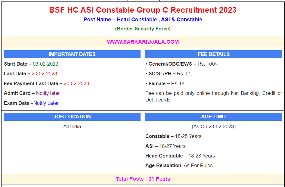 BSF HC ASI Constable Group C Recruitment 2023Post Name – Head Constable , ASI & Constable(Border Security Force) | |||||