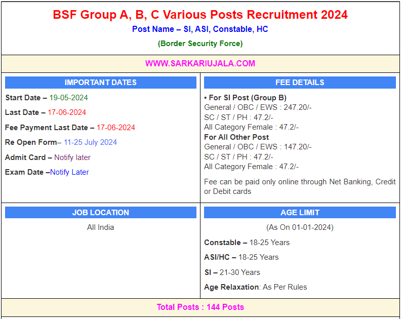 Post Description – BSF Border Security Force is inviting online applications for BSF SI, ASI, HC and Constable for 144 posts. Interested people meet all the eligibility criteria, apply online Details Of Recruitment Of BSF SI, ASI, HC and Constable Online Form 2024Posts Name – SI, ASI, HC and Constable Number Of Posts – 144 Posts Category Wise Posts – BSF Inspector Librarian – 02 Posts BSF SI Staff Nurse – 14 Posts BSF ASI Lab Tech – 38 Posts BSF ASI Physiotherapist – 47 Posts BSF SI Vehicle Mechanic – 03 Posts BSF Constable Technical – 34 Posts BSF Head Constable (Veterinary) – 04 Posts BSF Constable Kennelman – 02 Posts Pay Scale – As Per Rules Education Qualification – Inspector Librarian – Bachelor Degree in Library Science OR Library and Information Science from Any Recognized Institute in India with 2 Year Experience. Sub Inspector SI Staff Nurse – 10+2 Intermediate Exam with Degree / Diploma in General Nursing. And Registration in State Nursing Council. Assistant Sub Inspector ASI Lab Tech – 10+2 with science And Diploma in Medical Laboratory Technology Assistant Sub Inspector ASI (Physiotherapist) – 10+2 Intermediate with Science Stream with Degree / Diploma in Physiotherapy and 6 Month Experience. Sub Inspector SI (Vehicle Mechanic )– 3 Year Degree / Diploma in Auto Mobile Engineering OR Mechanical Engineering. Constable Technical (OTRP, SKT, Fitter, Carpenter, Auto Elect, Veh Mech, BSTS, Upholster) – 10th Matric with ITI Certificate Related Trade and 3 Year Experience in Related Trade Head Constable (Veterinary) – 10+2 Intermediate Exam with 1 Year Veterinary Stock Assistant Course and 1 year Experience. Constable Kennelman – 10th Matric Exam Passed with 2 Year Experience in Related Post. Physical Standard SI/ASI/Head Constable Height: 165 cm (Male), 150Cm (Female) Chest : 76cm -81 Cm Constable & CT(Ward Boy/Ward Girl/Aya) Height: 167.5 cm (Male), 157Cm (Female) Chest : 78cm -83 Cm How to Apply Online BSF HC, ASI, Constable Group C Online Form 2024 – Candidates can apply through link provided below or they can also apply through official site of the Border Security Force Before 17-06-2024 . Required Documents For Online Application – Educational Mark sheet And Certificates Aadhar Card / Pan Card Passport Size Photo Signature Selection Mode – Written Examination PET/PST Skill Test Merit List