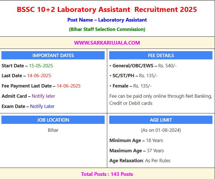 Post Description – BSSC Bihar Staff Selection Commission is inviting online applications for Laboratory Assistant for 143 posts. Interested people meet all the eligibility criteria, apply online Details Of Recruitment Of BSSC 10+2 Laboratory Assistant Online Form 2025Posts Name – Laboratory Assistant Number Of Posts – 143 Posts Category Wise Posts – General – 56 Posts EWS – 14 Posts BC – 18 Posts EBC – 27 Posts SC – 22 Posts ST – 01 Posts BC Female – 05 Posts Pay Scale – Level 4 Education Qualification – 10+2 Passed with Science From Any Recognised Board. How to Apply Online BSSC 10+2 Laboratory Assistant Online Form 2025 – Candidates can apply through link provided below or they can also apply through official site of the Bihar Staff Selection Board before 14/June/2025. Required Documents For Online Application – Educational Mark sheet And Certificates Residential Certificate Caste Certificate Aadhar Card / Pan Card Passport Size Photo Signature Selection Mode – Written Exam Merit List | |||||