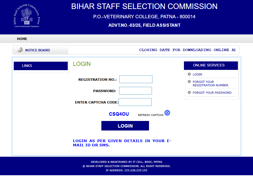 Post Description : BSSC Bihar Staff Selection Commission has released the admit card for the BSSC Bihar Field Assistant Recruitment 2025. The Written Exam is scheduled to begin on 11 July 2025. Interested candidates can download their admit card by using their roll number and date of birth. The recruitment is for a total of 201 posts under advertisement number 03/2025. Instructions for Downloading the BSSC Bihar Field Assistant Admit Card 2025: 1. In order to download their BSSC Bihar Field Assistant Admit Card 2025 candidates are required to go to the important link section provided below. 2. After getting the link candidates need to click it for downloading their BSSC Bihar Field Assistant Admit Card. 3. Candidates need to provide their following details-: Registration No. /Roll No. DOB/Password Captcha Code(if specified) 4. After providing their details appropriately candidates will be able to download their BSSC Bihar Field Assistant Admit Card. 5.Candidates can also download their Admit Card from official site of the BSSC.