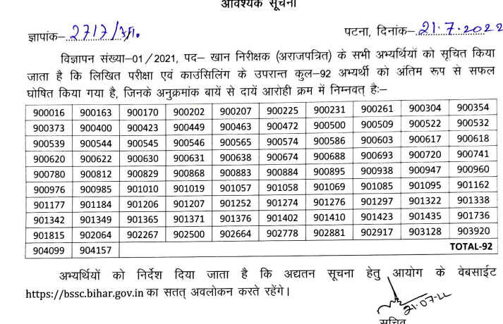 BSSC Mines Inspector MI Result 2021Post Name – Mines Inspector(Bihar Staff Selection Commission) | |||||