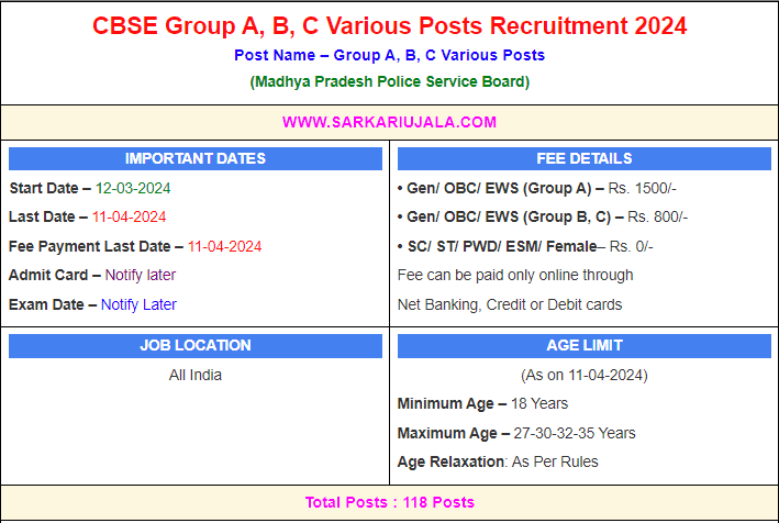 CBSE Group A, B, C Various Posts Recruitment 2024Post Name – Group A, B, C Various Posts(Madhya Pradesh Police Service Board) | |||||