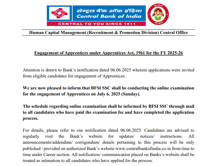 Post Description : The Central Bank Of India has Been released the admit card for the Central Bank Apprentice Recruitment 2025. Which Exam Date Is 06 July 2025 . Interested candidates can download their admit card by using their roll number and date of birth. The recruitment is for a total of 4500 posts . Instructions for Downloading the Central Bank Apprentice Admit Card 2025 : 1. In order to download their Central Bank Apprentice Admit Card 2025 candidates are required to go to the important link section provided below. 2. After getting the link candidates need to click it for downloading their Central Bank Apprentice Admit Card. 3. Candidates need to provide their following details-: Registration No. /Roll No. DOB/Password Captcha Code(if specified) 4. After providing their details appropriately candidates will be able to download their Central Bank Apprentice Admit Card from official site of the Central Bank.