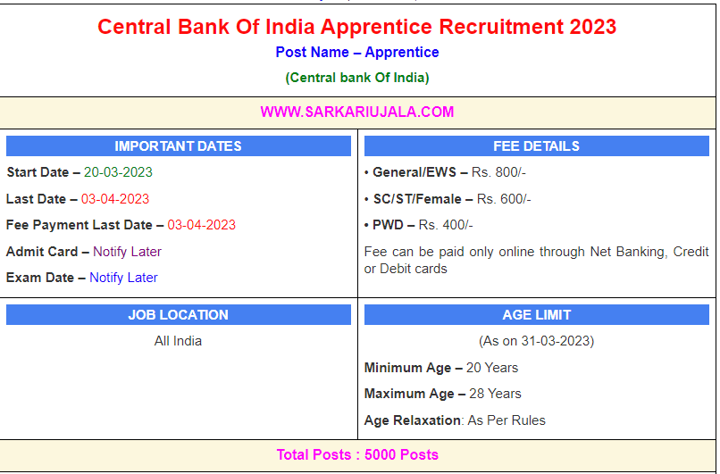 Post Description – CBI Central bank Of India is inviting online applications for Apprentice for 5000 posts. Interested people meet all the eligibility criteria, apply online Details Of Recruitment Of Central Bank Of India Apprentice Online Form 2023Posts Name – Apprentice Number Of Posts – 5000 Posts Category Wise Posts – General – 2159 Posts OBC – 1162 Posts SC – 763 Posts ST – 416 Posts EWS – 500 Posts Stipend – Rs.10000-15000/- Education Qualification – Bachelor Degree in in any discipline from a recognized University. How to Apply Online Central Bank Of India Apprentice Online Form 2023 – Candidates can apply through link provided below or they can also apply through official site of the Central Bank Of India before 03-April-2023. Required Documents For Online Application – Educational Mark sheet And Certificates Aadhar Card / Pan Card Passport Size Photo Signature Selection Mode – CBT Examination Merit List