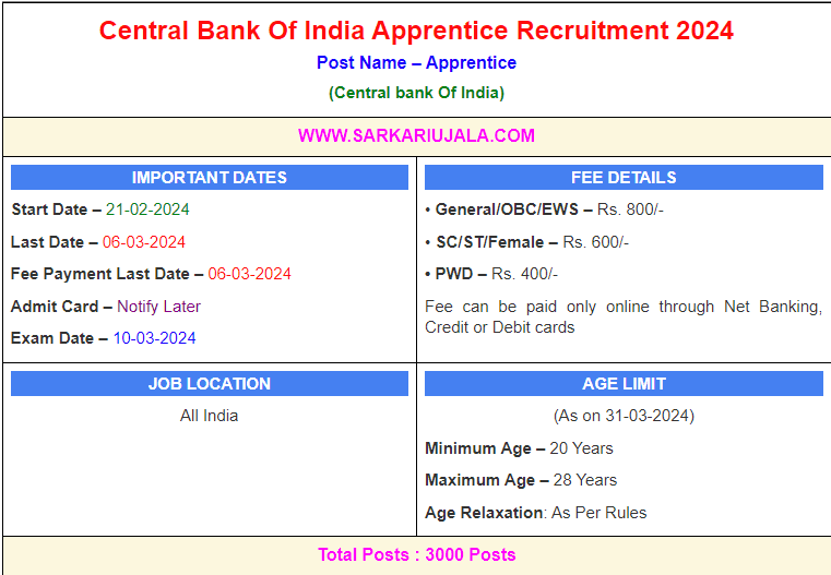 Post Description – CBI Central bank Of India is inviting online applications for Apprentice for 3000 posts. Interested people meet all the eligibility criteria, apply online Details Of Recruitment Of Central Bank Of India Apprentice Online Form 2024Posts Name – Apprentice Number Of Posts – 3000 Posts Category Wise Posts – Andaman and Nicobar Islands – 01 Posts Andhra Pradesh – 100 Posts Arunachal Pradesh – 10 Posts Assam – 70 Posts Bihar – 210 Posts Chandigarh(UT)- 11 Posts Chhattisgarh – 76 Posts Dadra and Nagar Haveli (UT) & DIU DAMAN- 03 Posts Delhi– 90 Posts Goa- 30 Posts Gujarat- 270 Posts Haryana- 95 Posts Himachal Pradesh- 26 Posts Jammu and Kashmir – 08 Posts Jharkhand- 60 Posts Karnataka- 110 Posts Kerala – 87 Posts Ladakh – 87 Posts Madhya Pradesh- 300 Posts Maharashtra – 320 Posts Manipur- 08 Posts Meghalaya- 05 Posts Mizoram- 03 Posts Nagaland- 08 Posts Orissa- 80 Posts Puducherry- 3 Posts Punjab- 115 Posts Rajasthan- 105 Posts Sikkim- 20 Posts Tamil Nadu- 142 Posts Telangana- 96 Posts Tripura – 07 Posts Uttar Pradesh- 305 Pots Uttarakhand – 30 Posts West Bengal- 194 Posts Stipend – Rs. 15000/- Education Qualification – Bachelor Degree in in any discipline from a recognized University. How to Apply Online Central Bank Of India Apprentice Online Form 2024 – Candidates can apply through link provided below or they can also apply through official site of the Central Bank Of India before 06 March 2024. Required Documents For Online Application – Educational Mark sheet And Certificates Aadhar Card / Pan Card Passport Size Photo Signature Selection Mode – CBT Exam Merit List