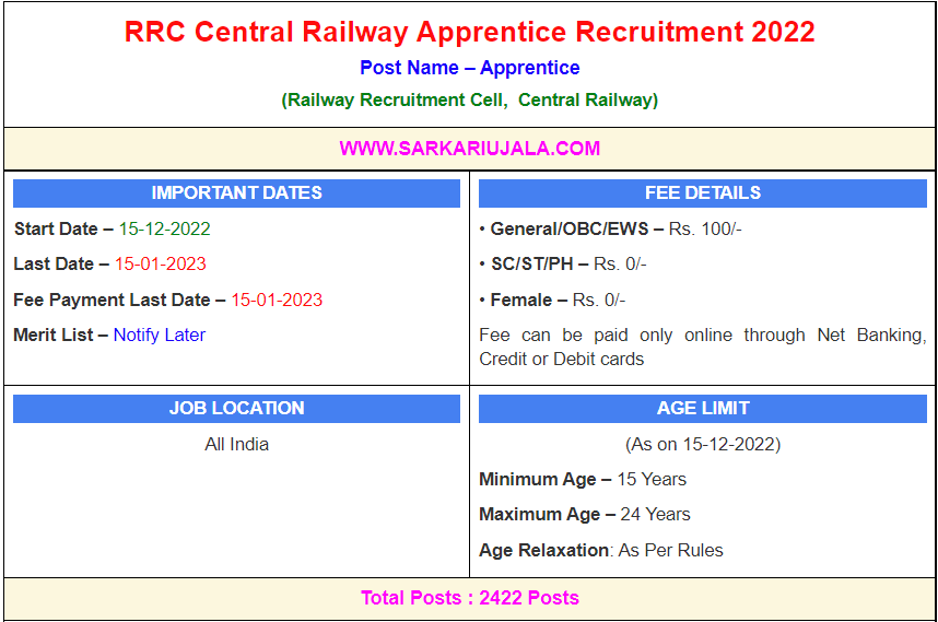 Post Description – RRC Railway Recruitment Cell, Central Railway is inviting online applications for Apprentice for 2422 posts. Interested people meet all the eligibility criteria, apply online Details Of Recruitment Of Central Railway Apprentice Online Form 2023Posts Name – Apprentice Number Of Posts – 2422 Posts Category Wise Posts – Mumbai Cluster – 1659 Posts Bhusawal Cluster – 418 Posts Pune Cluster – 152 Posts Nagpur Cluster – 114 Posts Solapur Cluster – 79 Posts Pay Scale – As Per Rules Education Qualification – 10th Passed with 50% Marks and ITI / NCVT Certificate in Related Trade. How to Apply Online Central Railway Apprentice Online Form 2023 – Candidates can apply through link provided below or they can also apply through official site of the Railway Recruitment Cell before 15/Jan/2023. Required Documents For Online Application – Educational Mark sheet And Certificates Aadhar Card / Pan Card Passport Size Photo Signature Selection Mode – Written Examination Final Merit List