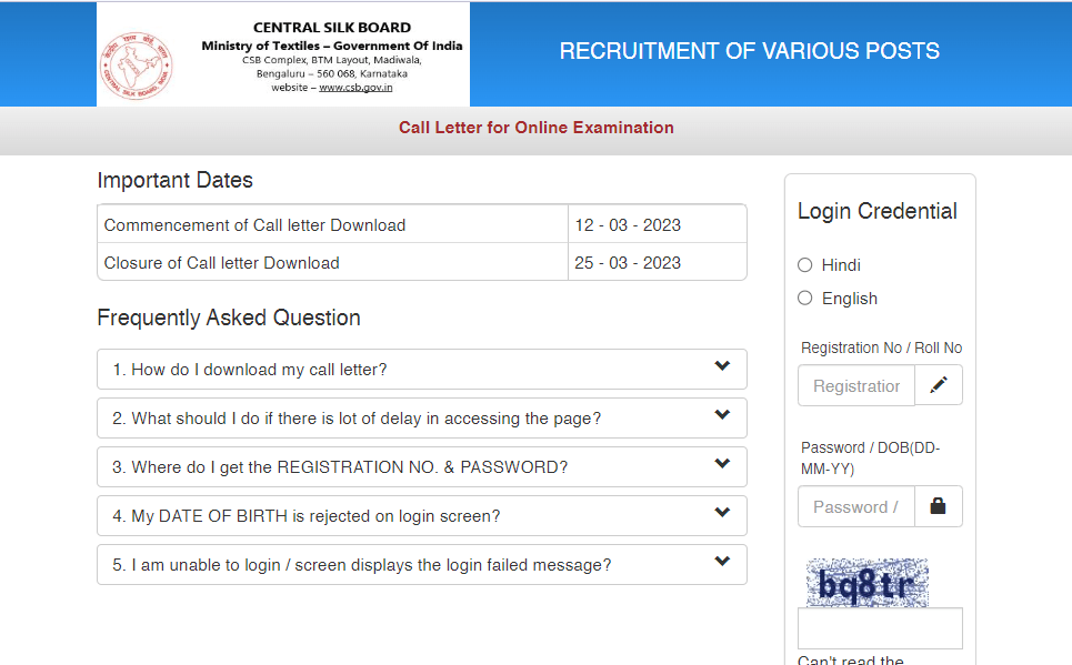 Post Description : CSB Central Silk Board Has Been Released Admit Card For Central Silk Board Various Post Online Form 2022. Which Exam Date Is 18-25 March 2023. Interested People Download Admit card With Using Your Roll No & DOB . Instructions for Downloading the CSB Central Silk Board Various Post Admit Card 2023: 1. In order to download their Central Silk Board Various Post Admit Card 2023 candidates are required to go to the important link section provided below. 2. After getting the link candidates need to click it for downloading their Central Silk Board Various Post Admit Card. 3. Candidates need to provide their following details-: Registration No. /Roll No. DOB/Password Captcha Code(if specified) 4. After providing their details appropriately candidates will be able to download their Central Silk Board Various Post Admit Card. 5.Candidates can also download their Admit Card from official site of the CSB.