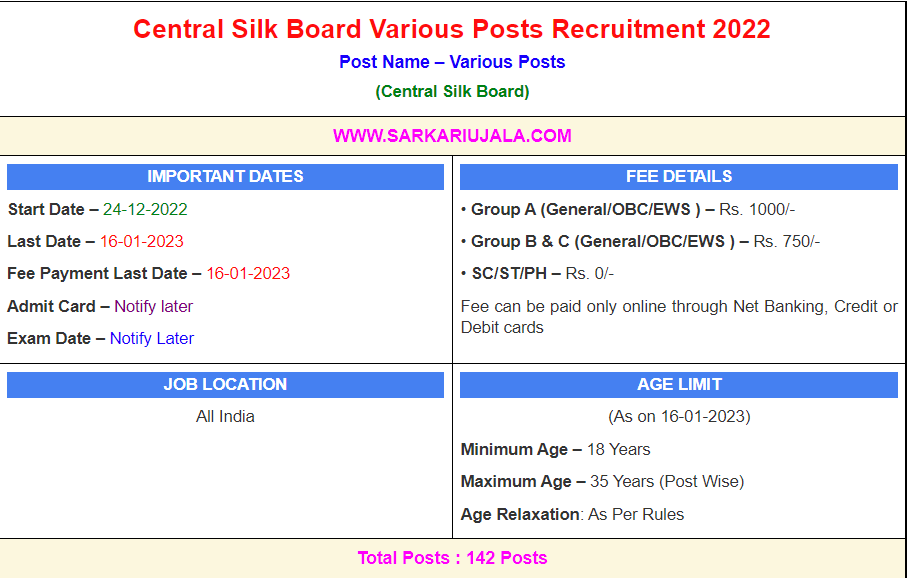 Post Description – CSB Central Silk Board is inviting online applications for Various Posts for 142 posts. Interested people meet all the eligibility criteria, apply online Details Of Recruitment Of CSB Central Silk Board Various Posts Online Form 2023Posts Name – Various Posts Number Of Posts – 142 Posts Category Wise Posts – Upper Division Clerk (Group C) – 85 Posts Stenographer Grade II (Group C) – 04 Posts Field Assistant (Group C) – 01 Posts Cook (Group C) – 02 Posts Computer Programmer (Group B) – 01 Posts Assistant Superintendent(Admn) (Group B) – 25 Posts Assistant Superintendent (Tech.) (Group B) – 05 Posts Stenographer Grade I (Group B) – 02 Posts Library and Information Assistant (Group B) – 02 Posts Junior Engineer (Electrical) (Group B) – 05 Posts Junior Translator (Hindi) Group B – 04 Posts Assistant Director (A&A) (Group A)– 04 Posts Pay Scale – As Per Rules Education Qualification – Upper Division Clerk (Group C) – Bachelor Degree And English Typing 35 WPM OR Hindi 30 WPM Stenographer Grade II (Group C) – Bachelor Degree And 5 Year Experience. And Dictation 10 min at 80 WPM, And Transcription on Computer 50 Min English, And 65 Min Hindi Field Assistant (Group C) – 10th Passed or Diploma in Sericulture. Cook (Group C) – Diploma in Catering with 3 Year Experience Computer Programmer (Group B) – Bachelor Degree with II Class in Computer Science and 2 Year Experience OR Bachelor Degree in Science, Math, Statistics, Commerce, Economics and PG Diploma in Computer with 2 Year Experience OR M.Sc in Computer Science Assistant Superintendent(Admn.) (Group B) – Bachelor Degree with 5 Year Experience. Assistant Superintendent (Tech.) (Group B) – Bachelor Degree with 50% Marks in Zoology / Botany / Agriculture / Sericulture Stenographer Grade I (Group B) – Bachelor Degree in Any Stream with 5 Year Experience. And Dictation 10 min at 120 WPM, And Transcription on Computer 5 Min English, 9 Min Hindi Library and Information Assistant (Group B) – Bachelor’s Degree in Library Science or Library and Information Science Junior Engineer (Electrical) (Group B) – Diploma in Electrical Engineering. Junior Translator (Hindi) Group B – Master Degree in Hindi with English as a Compulsory Subject OR Master Degree in English with Hindi as Compulsory Subject in Degree Level OR Master Degree in Any Subject Othern than Hindi in Degree Level OR English, with Hindi Medium and English as a Compulsory Subject in Degree Level OR Master Degree in Any Subject with English Medium and Hindi a Compulsory Subject in Degree level. Assistant Director (A&A) (Group A)– CA / CS / MBA / M.Com How to Apply Online CSB Central Silk Board Various Posts Online Form 2023 – Candidates can apply through link provided below or they can also apply through official site of the Central Silk Board before 16/Jan/2023. Required Documents For Online Application – Educational Mark sheet And Certificates Aadhar Card / Pan Card Passport Size Photo Signature Selection Mode – Written Examination Final Merit List