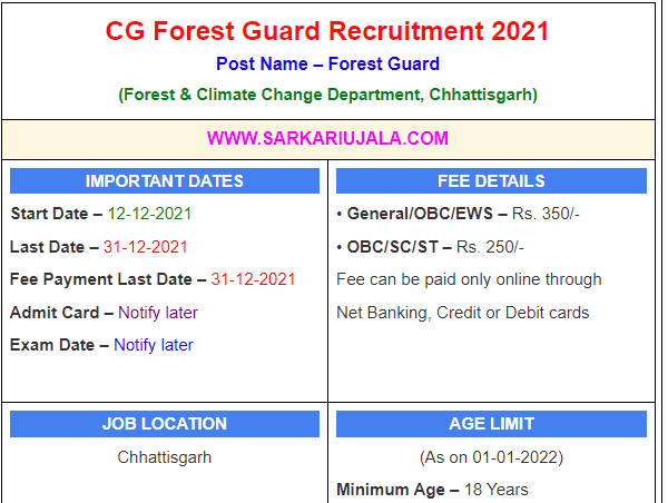Post Description –Forest & Climate Change Department, Chhattisgarh is inviting online applications for Forest Guard for 291 posts. Interested people meet all the eligibility criteria, apply online Details Of Recruitment Of CG Forest Guard Online Form 2021Posts Name – Forest Guard Number Of Posts – 291 Posts Category Wise Posts – General – 104 Posts OBC – 33 Posts SC – 29 Posts ST – 125 Posts Pay Scale – Rs.5200 – 20000/- + Grade Pay Rs.1900/- (Level 4) Education Qualification – Class 12th Class Pass From A Recognized Board. Physical Standard Height & Chest For General/OBC/SC Height: 163 cm (Male), 150Cm (Female) Chest : 79cm -84 Cm Height & Chest For ST– Height: 152 cm (Male), 145Cm (Female) Chest – 79cm – 84 cm Running- 800 Meter in 3 Minute (Male) ,800 Meter in 4 Minute (Female) Running- 200 Meter in 30 Second (Male) ,200 Meter in 34.5 Second (Female) Gola Throw – 7.62 Kg Gola 05 Meter (Male), 4 KG Gola 4 Meter (Female) Long Jump – 3.75 Meter (Male ) In 3 Chance, 2.50 Meter In 3 Chance (Female) How to Apply Online CG Forest Guard Online Form 2021 – Candidates can apply through link provided below or they can also apply through official site of the CG Forest Guard before 31/Dec/2021. Required Documents For Online Application – 10th / 12th Mark sheet And Certificates Aadhar Card / Pan Card Passport Size Photo Signature Selection Mode – Written Examination PET/PST Final Merit List