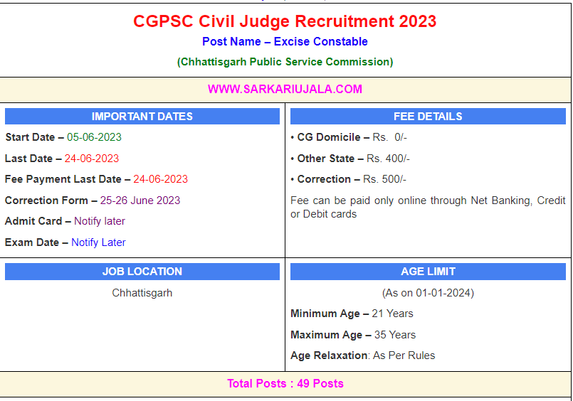 IMPORTANT DATESStart Date – 05-06-2023 Last Date – 24-06-2023 Fee Payment Last Date – 24-06-2023 Correction Form – 25-26 June 2023 Date of Exam – 03-09-2023 Admit Card – 25-08-2023 | FEE DETAILS• CG Domicile – Rs. 0/- • Other State – Rs. 400/- • Correction – Rs. 500/- Fee can be paid only online through Net Banking, Credit or Debit cards | ||||