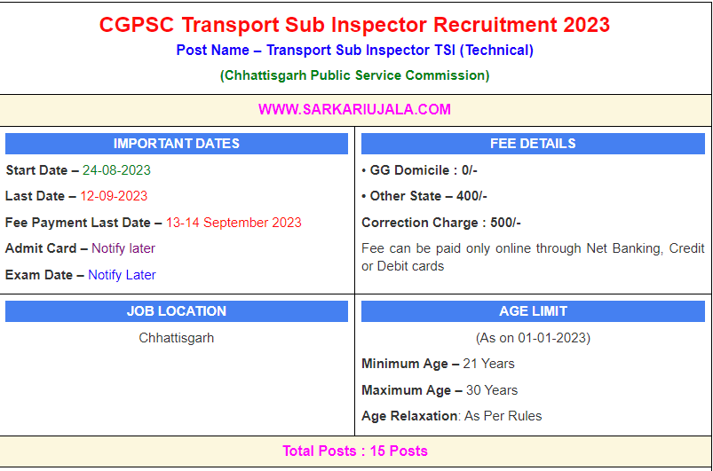 CGPSC Transport Sub Inspector Recruitment 2023Post Name – Transport Sub Inspector TSI (Technical)(Chhattisgarh Public Service Commission) | |||||