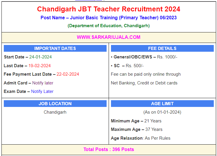 Post Description – Department of Education, Chandigarh is inviting online applications for Primary Teacher for 396 posts. Interested people meet all the eligibility criteria, apply online Details Of Recruitment Of Chandigarh JBT Teacher Online Form 2023Posts Name –Primary Teacher Number Of Posts – 396 Posts Category Wise Posts – General – 179 Posts OBC – 94 Posts SC – 84 Posts EWS – 39 Posts Pay Scale – Rs.9300 – 34800/- + Grade Pay Rs.4200/- Education Qualification – Graduation Degree in Any Stream with D.El.Ed and CTET Primary Level Exam Passed OR Graduation Degree in Any Stream 50% Marks with B.Ed Degree and CTET Primary Level Exam Passed. How to Apply Online Chandigarh JBT Teacher Online Form 2024 – Candidates can apply through link provided below or they can also apply through official site of the Department of Education, Chandigarh before 19/February/2024. Required Documents For Online Application – Educational Mark sheet And Certificates Aadhar Card / Pan Card Passport Size Photo Signature Selection Mode – Written Examination Merit List
