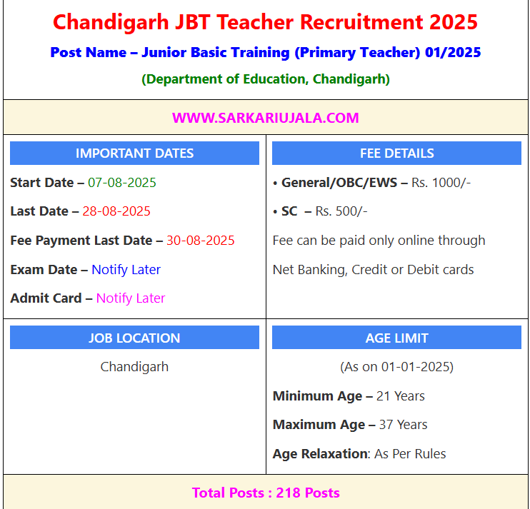 Post Description – Department of Education, Chandigarh is inviting online applications for Primary Teacher for 218 posts. Interested people meet all the eligibility criteria, apply online Details Of Recruitment Of Chandigarh JBT Teacher Online Form 2025Posts Name – Primary Teacher Number Of Posts – 218 Posts Category Wise Posts – General – 111 Posts OBC – 44 Posts SC – 41 Posts EWS – 22 Posts Pay Scale – Fixed remuneration of Rs.45260/-per month Education Qualification – Graduation Degree in Any Stream with D.El.Ed and CTET Primary Level Exam Passed OR Graduation Degree in Any Stream 50% Marks with B.Ed Degree and CTET Primary Level Exam Passed. How to Apply Online Chandigarh JBT Teacher Online Form 2025 – Candidates can apply through link provided below or they can also apply through official site of the Department of Education, Chandigarh before 28/August/2025. Required Documents For Online Application – Educational Mark sheet And Certificates Aadhar Card / Pan Card Passport Size Photo Signature Selection Mode – Written Exam Merit List
