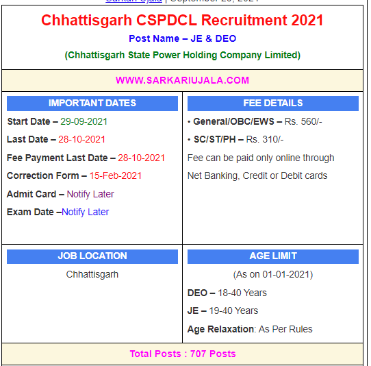 Post Description – Chhattisgarh State Power Holding Company Limited is inviting online applications for JE & DEO for 707 posts. Interested people meet all the eligibility criteria, apply online Details Of Recruitment Of Chhattisgarh CSPDCL DEO & JE Online Form 2021Posts Name – Junior Engineer & Date Entry Operator Number Of Posts – 707 Posts Category Wise Posts – Data Entry Operator (DEO) – 400 Posts General – 171 Posts OBC – 59 Posts SC – 45 Posts ST – 125 Posts Junior Engineer (JE) – 307 Posts General – 213 Posts OBC – 32 Posts SC – 24 Posts ST – 38 Posts Pay Scale – As Per Rules Education Qualification – DEO – Bachelor Degree with Second Division & 1 Year Diploma Certificate In Data Entry Operator/ Programming & 5000 Key Depression Per Hour In English And Hindi In Computer. Junior Engineer (JE)- 3 Years Diploma Degree in Related Trade. How to Apply Online Chhattisgarh CSPDCL DEO & JE Online Form 2021– Candidates can apply through link provided below or they can also apply through official site of the Chhattisgarh State Power Holding Company Limited before 28/Oct/2021. Required Documents For Online Application – Educational Mark sheet And Certificates Aadhar Card / Pan Card Passport Size Photo Signature Selection Mode – CBT Examination Skill Test Final Merit List
