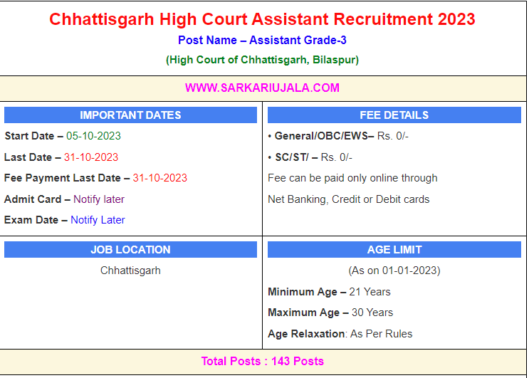 Chhattisgarh High Court Assistant Recruitment 2023Post Name – Assistant Grade-3(High Court of Chhattisgarh, Bilaspur) | |||||