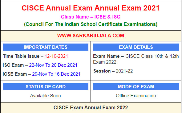 IMPORTANT DATESTime Table Issue – 22-10-2021 ISC Exam – 22-Nov To 20 Dec 2021 ICSE Exam – 29-Nov To 16 Dec 2021 | EXAM DETAILSExam Name – CISCE Class 10th & 12th Exam 2022 Session – 2021-22 | ||||