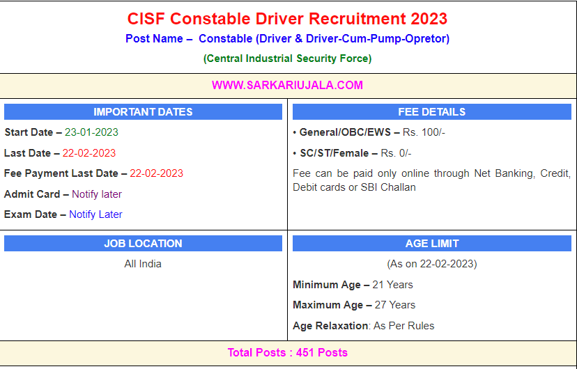 Post Description – CISF Central Industrial Security Force is inviting online applications for Constable (Driver) for 708 posts. Interested people meet all the eligibility criteria, apply online Details Of Recruitment Of CISF Constable Driver Online Form 2023Posts Name – Constable (Driver & Driver-Cum-Pump-Opretor) Number Of Posts – 708 Posts Category Wise Posts – Constable (Driver) – 372 Posts General – 153 Posts EWS– 37 Posts OBC– 100 Posts SC– 55 Posts ST – 27 Posts Constable/(Driver -Cum -Pump -Operator) – 336 Posts General – 138 Posts EWS– 33 Posts OBC– 90 Posts SC– 50 Posts ST – 25 Posts Pay Scale – Rs. 21700/- To Rs. 69,100/- Education Qualification – 10th Passed From Any Recognized Board And Having Driving License with 03 years experience of driving HMV / TV/LMV And Motor Cycle. Physical Standard Height: 167 cm (Male Only) Chest : 80cm -85 Cm Race-: 800 Meter in 03 Minute 15 second (Male Only) Long Jump-: 11 Feet in 03 Chance High Jump-: 3 feet 06 Inches In 3 chance How to Apply Online CISF Constable Driver Online Form 2023– Candidates can apply through link provided below or they can also apply through official site of the Central Industrial Security Force before 22/February/2023. Required Documents For Online Application – 10th Mark sheet And Certificates Aadhar Card / Pan Card Passport Size Photo Signature Selection Mode – Written Examination Skill Test Medical Merit List