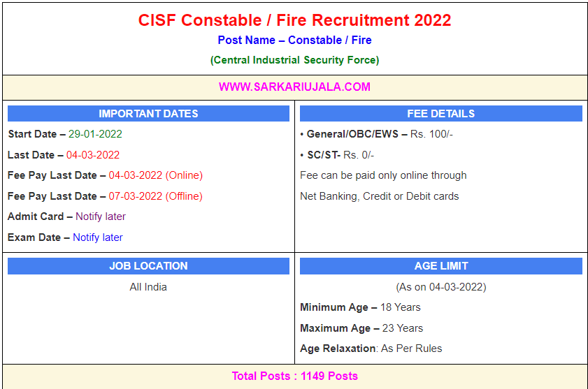 Post Description – CISF Central Industrial Security Force is inviting online applications for Constable/Fire for 1701 posts. Interested people meet all the eligibility criteria, apply online Details Of Recruitment Of CISF Constable / Fire Online Form 2022Posts Name – Constable / Fire Number Of Posts – 1701 Posts Category Wise Posts – General – 725 Posts OBC – 379 Posts SC – 243 Posts ST – 201 Posts EWS – 173 Posts State Wise Posts – Andhra Pradesh– 118 Posts Arunachal Pradesh – 11 Posts Assam – 155 Posts Bihar – 186 Posts Chandigarh – 01 Posts Chhattisgarh – 60 Posts Delhi – 15 Posts Goa – 01 Posts Gujarat – 51 Posts Haryana – 22 Posts Himachal Pradesh – 06 Posts Jammu & Kashmir – 61 Posts Jharkhand – 132 Posts Karnataka – 52 Posts Kerala – 60 Posts Ladakh – 01 Posts Madhya Pradesh – 75 Posts Maharashtra – 105 Posts Manipur – 15 Posts Meghalaya – 18 Posts Mizoram – 07 Posts Nagaland – 11 Posts Odisha – 87 Posts Puducherry – 01 Posts Punjab – 24 Posts Rajasthan – 58 Posts Tamil Nadu – 61 Posts Telangana – 46 Posts Tripura – 21 Posts Uttar Pradesh – 169 Posts Uttarakhand – 09 Posts West Bengal – 82 Posts Pay Scale – Rs.21700 – 69100/- Education Qualification – 10+2 Passed With Science From A Recognized Board. (Only Male) Physical Standard Height: 170cm (Male) Chest : 80cm -85 Cm Running- 05 KM in 24 Minute How to Apply Online CISF Constable / Fire Online Form 2022 – Candidates can apply through link provided below or they can also apply through official site of the Central Industrial Security Force before 04/March/2022. Required Documents For Online Application – 10th / 12th Mark sheet And Certificates Aadhar Card / Pan Card Passport Size Photo Signature Selection Mode – OMR/CBT Examination PET/PST Final Merit List