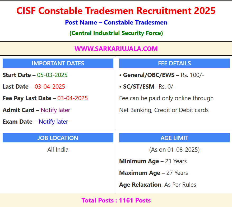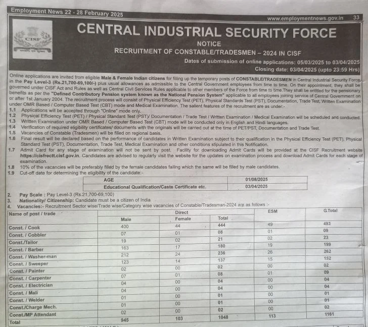 Post Description – The Central Industrial Security Force (CISF) has released the Constable Tradesmen Recruitment 2025. Candidates who have passed 10th from a recognized board can apply. Stay tuned for more details on the application process. Details Of Recruitment Of CISF Constable Driver Online Form 2025Posts Name – Constable Driver Number Of Posts – 1161 Posts Category Wise Posts – Male (Constable) – 945 Posts Cook – 400 Posts Cobbler– 07 Posts Trailor– 19 Posts Barber – 163 Posts Washerman – 212 Posts Sweeper – 123 Posts Painter – 02 Posts Carpenter – 07 Posts Electrician – 04 Posts Mali – 04 Posts Welder – 01 Posts Charge Mechanic – 01 Posts MP Attendant – 02 Posts Female (Constable) – 103 Posts Cook – 44Posts Cobbler– 01 Posts Trailor– 02 Posts Barber – 17 Posts Washerman – 24 Posts Sweeper – 14 Posts Painter – 00 Posts Carpenter – 01 Posts Electrician – 00 Posts Mali – 00 Posts Welder – 00 Posts Charge Mechanic – 00 Posts MP Attendant – 00 Posts ESM – 113 Posts Cook – 49 Posts Cobbler– 01 Posts Trailor– 02 Posts Barber – 19 Posts Washerman – 26 Posts Sweeper – 15 Posts Painter – 00 Posts Carpenter – 01 Posts Electrician – 00 Posts Mali – 00 Posts Welder – 00 Posts Charge Mechanic – 00 Posts MP Attendant – 00 Posts Pay Scale – Rs. 21,700 – 69,100/- Education Qualification – 10th Passed From A Recognized Board Physical Standard Height: 170 cm (Male), 157Cm (Female) Chest : 80cm -85 Cm Race-: 1.6 KM in 06 Minute 30 second (Male), 800 Meter In 04 Minute (Female) How to Apply Online CISF Constable Tradesmen Online Form 2025 – Candidates can apply through link provided below or they can also apply through official site of the Central Industrial Security Force before 03/April/2025. Required Documents For Online Application – 10th / 12th Mark sheet And Certificates Driving Licence Aadhar Card / Pan Card Passport Size Photo Signature Selection Mode – OMR/CBT Exam Driving Test PET/PST Final Merit List