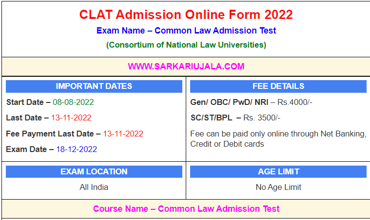 CLAT Admission Online Form 2022Exam Name – Common Law Admission Test(Consortium of National Law Universities) | |||||