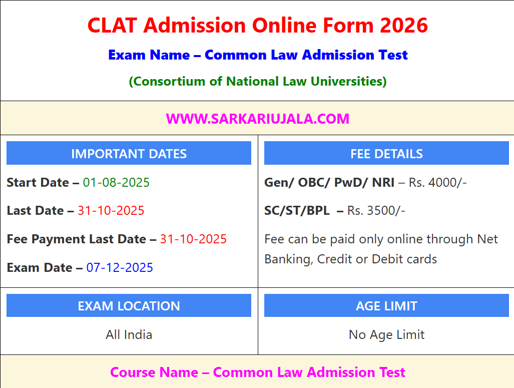 Post Description – NLU Consortium of National Law Universities is inviting online applications for CLAT 2026 Form. Interested people meet all the eligibility criteria, apply online Details Of Recruitment Of CLAT 2026 Admission Online FormCourse Name – BA LLB, BCom LLB, BSc LLB, BBA LLB, BSW LLB, LLM Education Qualification – For UG/LLB- 10+2 Passed With 45% Marks (For Reserve Category 40% Marks). For PG- LL.B. Degree Passed With 50% Marks (For Reserve Category 45% Mark. Details Of Participating Universities -:NLSIU Bengaluru, NALSAR Hyderabad, NLIU Bhopal , WBNUJS Kolkata, NLU Jodhpur, HNLU Raipur, GNLU Gandhinagar , RMLNLU Lucknow , RGNUL Punjab , CNLU Patna , NUALS Kochi , NLUO Odisha, NUSRL Ranchi , NLUJA Assam, DSNLU Visakhapatanam, TNNLU Tiruchirappalli , MNLU Mumbai , MNLU Nagpur, MNLU Aurangabad, HPNLU Shimla , DNLU Jabalpur & DBRANLU Haryana How to Apply Online CLAT 2026 Admission Online Form – Candidates can apply through link provided below or they can also apply through official site of the NLU Consortium of National Law Universities before 31/October/2025. Required Documents For Online Application – Educational Mark sheet And Certificates Aadhar Card / Pan Card Passport Size Photo Signature Selection Mode – Written Exam