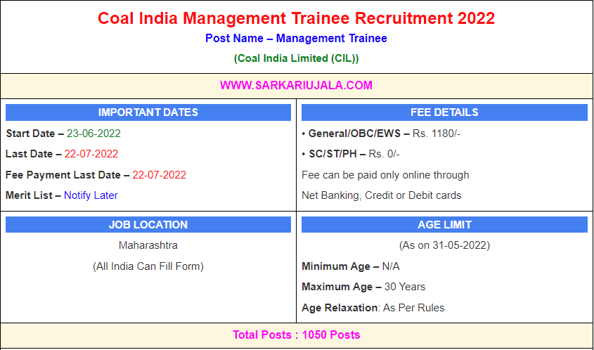 Post Description – Coal India Limited is inviting online applications for Management Trainee for 1050 posts. Interested people meet all the eligibility criteria, apply online Details Of Recruitment Of Coal India MT Online Form 2022Posts Name – Management Trainee Number Of Posts – 1050 Posts Category Wise Posts – Mining– 699 Posts Civil – 160 Posts Electronics & Telecommunication – 124 Posts System and EDP – 67 Posts Pay Scale – Rs.50,000 – 1,60,000/- + Grade Pay Education Qualification – Mining/Civil/ Electronics & Telecommunication – BE/ B.Tech/ B.Sc (Engg.) in relevant branch of Engineering with minimum 60% marks. System and EDP –BE/ B.Tech/ B.Sc (Engg.) in Computer Science/Computer Engg./IT or MCA, with minimum 60% marks Note- Eligible candidates must have appeared for the Graduate Aptitude Test in Engineering (GATE – 2022). How to Apply Online Coal India MT Online Form 2022 – Candidates can apply through link provided below or they can also apply through official site of the Coal India Limited before 22/July/2022. Required Documents For Online Application – Educational Mark sheet And Certificates Aadhar Card / Pan Card Passport Size Photo Signature Selection Mode – Final Merit List