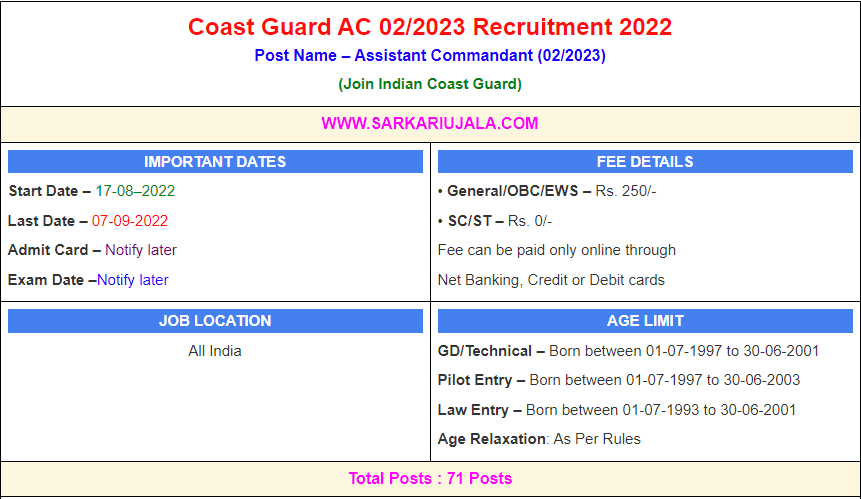 Post Description – Join Indian Coast Guard is inviting online applications for Assistant Commandant For 71 posts. Interested people meet all the eligibility criteria, apply online Details Of Recruitment Of Coast Guard AC 02/2023 Online FormPosts Name – Assistant Commandant Number Of Posts – 71 Posts Category Wise Posts – GD/ CPL (SSA) – 50 Posts Technical (Engg)/ Technical (Elect ) – 20 Posts Law – 01 Posts Pay Scale – Rs.56100 – 225000/- + Grade Pay Rs.1900/- Education Qualification – General Duty (GD) – Bachelor Degree with Minimum 60% Marks . & Maths, Physics as a Subject in 10+2 Level Examination Commercial Pilot– 12th Passed with 60% Marks and Valid Commercial Pilot License from DGCA. Technical– Engineering degree with 60% marks in aggregate & Atleast 60% marks in aggregate in Physics and Maths in 12th class. Law– Degree in Law from a recognized university with minimum 60% marks. Physical Standard Height & Chest For GD/Technical Height: 157 cm (Male), 152 cm (Female), Chest : minimum expansion 5 cms Height & Chest Commercial Pilot– Height: 162.5 cm (Male/Female) Chest : minimum expansion 5 cms How to Apply Online Coast Guard AC 02/2023 Online Form – Candidates can apply through link provided below or they can also apply through official site of the Join Indian Coast Guard before 07/Sep/2023. Required Documents For Online Application – Educational Mark sheet And Certificates Aadhar Card / Pan Card Passport Size Photo Signature Selection Mode – Stage I & Stage II PET/PST Final Merit List
