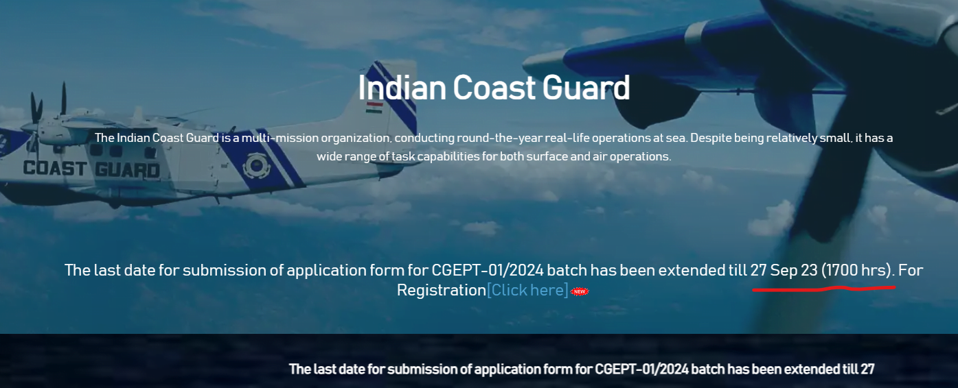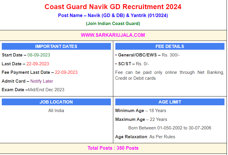 Post Description – Join Indian Coast Guard is inviting online applications for Navik GD , Navik DB & Yantrik (01/2024) for 350 posts. Interested people meet all the eligibility criteria, apply online Details Of Recruitment Of Coast Guard Navik GD,DB Online Form 2024Posts Name – Navik & Yantrik Number Of Posts – 350 Posts Category Wise Posts – Navik (GD)- 260 Posts General – 104 Posts EWS- 27 Posts OBC- 52 Posts SC- 42 Posts ST- 35 Posts Navik (DB) – 30 Posts General – 12 Posts EWS- 03 Posts OBC- 09 Posts SC- 04 Posts ST- 02 Posts Yantrik (Mechanical) – 25 Posts General – 10 Posts EWS- 06 Posts OBC- 04 Posts SC- 04 Posts ST- 01 Posts Yantrik (Electrical) – 20 Posts General – 08 Posts EWS- 03 Posts OBC- 4 Posts SC- 03 Posts ST- 02 Posts Yantrik (Electronics) – 15 Posts General – 06 Posts EWS- 01 Posts OBC- 05 Posts SC- 02 Posts ST- 01 Posts Pay Scale – Navik – Rs. 21700/- (Level-3) Yantrik– 29200 /- (Level 5) Education Qualification – Navik (GD)- 12th Passed With Math & Physics From Any Recognized Board Navik (DB)- 10th Passed From Any Recognized Board Yantrik- 10th passed And Diploma in Electrical /Mechanical /Electronics /Telecommunication (Radio/Power) Engineering of 03 or 04 years’ duration, approved by AICTE. OR 10th and 12th passed And Diploma in Electrical /Mechanical /Electronics /Telecommunication (Radio/Power) Engineering of 02 or 03 years’ duration, approved by AICTE. Physical Standard Height & Chest Height: 157 cm Chest : Minimum expansion 5 cms Running- 1600 Meter in 7 Minute Push-Ups – 10 Uthak Baithak – 20 How to Apply Online Coast Guard Navik GD,DB 01/2024 Online Form – Candidates can apply through link provided below or they can also apply through official site of the Join Indian Coast Guard before 22/September/2023. Required Documents For Online Application – 10th / 12th / Diploma Mark sheet And Certificates Aadhar Card / Pan Card Passport Size Photo Signature Selection Mode – Written Examination PET/PST Merit List