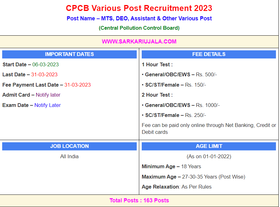 Post Description – CPCB Central Pollution Control Board is inviting online applications for MTS, DEO, Assistant & Other Various Post for 163 posts. Interested people meet all the eligibility criteria, apply online Details Of Recruitment Of CPCB Various Post Online Form 2023Posts Name – MTS, DEO, Assistant & Other Various Post Number Of Posts – 163 Posts Category Wise Posts – Junior Laboratory Assistant – 15 Posts Lower Division Clerk – 05 Posts Field Attendant – 08 Posts Multi-Tasking Staff (MTS) – 07 Posts Junior Technician – 03 Posts Assistant – 03 Posts Upper Division Clerk (UDC) – 16 Posts Data Entry Operator Grade II – 03 Posts Scientist B – 62 Posts Assistant Law Officer – 06 Posts Assistant Account Officer – 01 Posts Senior Scientific Assistant – 16 Posts Technical Supervisor – 01 Posts Senior Laboratory Assistant – 15 Posts Accounts Assistant – 02 Posts Pay Scale – As Per Rules Education Qualification – Junior Laboratory Assistant – 12th Passed with Science Subject. Lower Division Clerk – 12th Passed with Computer Typing in English 35 wpm OR Hindi 30 wpm within 10 Minutes. Field Attendant – 10th Passed Multi-Tasking Staff (MTS) – 10th Passed from Any Recognized Board OR ITI Certificate in Electrician / Plumber / Fire & Safety / Pump Operator Junior Technician – Diploma in Electronics with Experience. & 1 year experience in servicing laboratory machines. Assistant – Bachelor Degree in Any Stream with Computer Typing 35 wpm / Hindi 30 wpm Upper Division Clerk (UDC) – Bachelor Degree And Computer Typing in English 35 wpm OR Hindi 30 wpm within 10 Minutes. Data Entry Operator Grade II – 12th Passed From Any Stream with 8000 Key Depressions Per Hour for Data Entry Work. Scientist B – Bachelor Degree in Engineering / Technology in Civil / Chemical / Environmental / Computer Science / IT OR Post Graduation in Chemistry All Branches / Environmental Science. Assistant Law Officer – Bachelor Degree in Law with Experience . Assistant Account Officer – Bachelor Degree in Commerce with Experience. Senior Scientific Assistant – Possessing Master’s degree in science or Institution with two years’ experience in relevant field. Technical Supervisor – Degree in Instrumentation Engineering with three years’ experience in the relevant field. Senior Laboratory Assistant – 12th Passed with Science with 3 year of experience in the relevant field. Accounts Assistant – Bachelor Degree in Commerce with 3 Years Experience. How to Apply Online CPCB Various Post Online Form 2023 – Candidates can apply through link provided below or they can also apply through official site of the Central Pollution Control Board before 31/March/2023. Required Documents For Online Application – Educational Mark sheet And Certificates Aadhar Card / Pan Card Passport Size Photo Signature Selection Mode – Written Exam Skill Test Interview Merit List