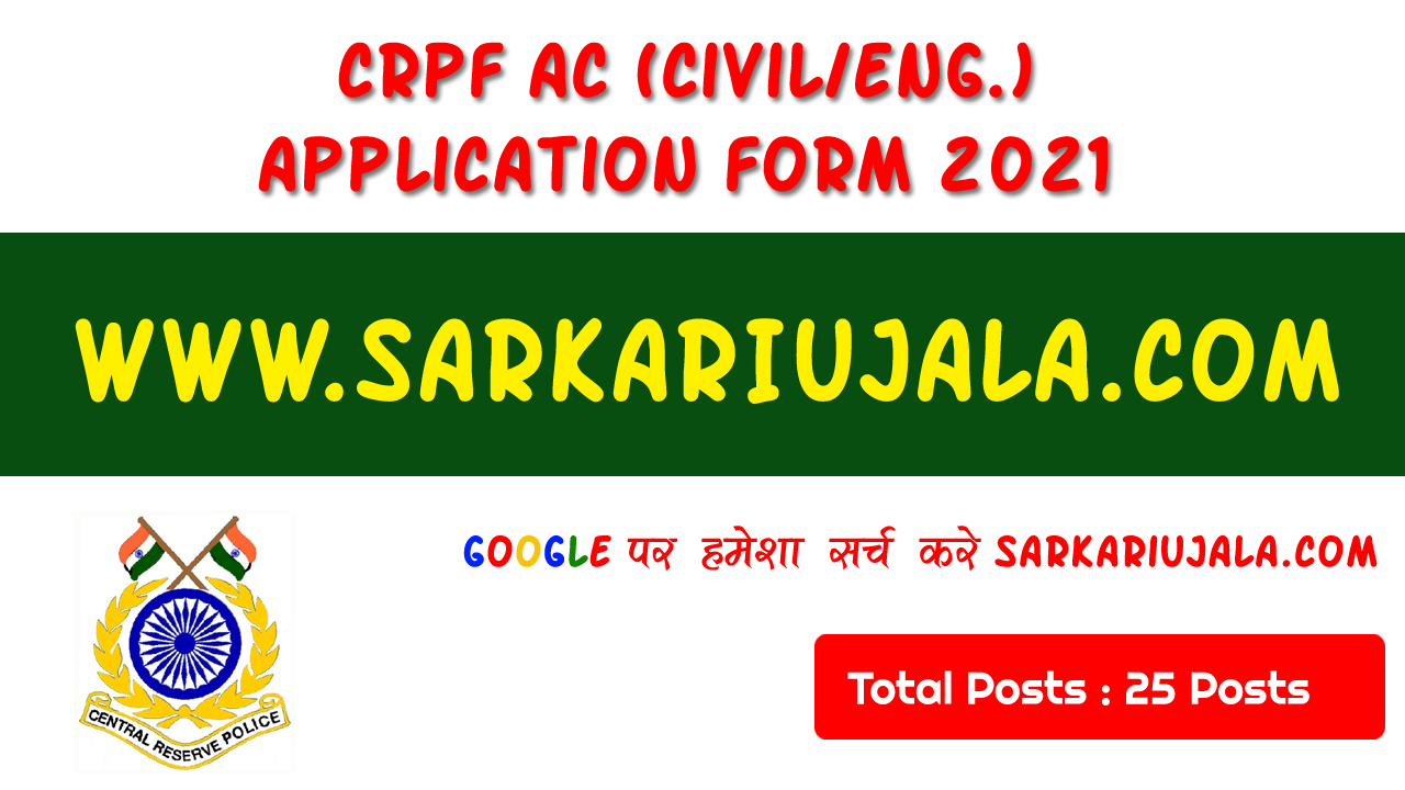 Post Description –Central Reserve Police Force is inviting online applications for Assistant Commandant for 25 posts. Interested people meet all the eligibility criteria, apply online Details Of Recruitment Of CRPF AC (Civil/Eng.) Application Form 2021Posts Name – Assistant Commandant Number Of Posts – 25 Posts Category Wise Posts – General – 13 Posts OBC – 06 Posts SC – 03 Posts ST – 01 Posts EWS – 02 Posts Pay Scale – Rs.56100 – 1,77,500/- {Level 10} Education Qualification – Bachelor’s Degree in Civil Engineering from a recognized University Physical Standard Height & Chest Height: 165 cm (Male), 157Cm (Female) Chest : 81cm -86 Cm Running- 1. 800 Meter in 3 Minute 45 Second (Male) ,800 Meter in 4 Minute 45 Second (Female) 2. 100 Meter in 16 Second (Male) ,100 Meter in 18 Second (Female) Gola Throw – 7.26 Kg Gola 4.5 Meter (Male) Long Jump – 3.5 Meters (Male ) In 3 Chance, 3 meter In 3 Chance (Female) How to Apply Online CRPF AC (Civil/Eng.) Application Form 2021 – Candidates can apply Offline provided below Given dispatching Address “DIG, Group Centre, CRPF, Rampur, District-Rampur, U.P.-244901” Before 29/July/2021. Required Documents For Online Application – Educational Mark sheet And Certificates Aadhar Card / Pan Card 2 Passport Size Photo Signature Selection Mode – Written Examination PET PST Interview Medical Test Final Merit List