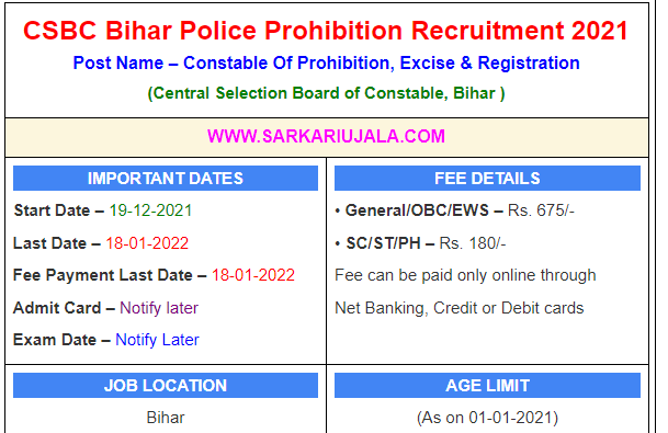 CSBC Bihar Police Prohibition Recruitment 2021Post Name – Constable Of Prohibition, Excise & Registration(Central Selection Board of Constable, Bihar ) | |||||