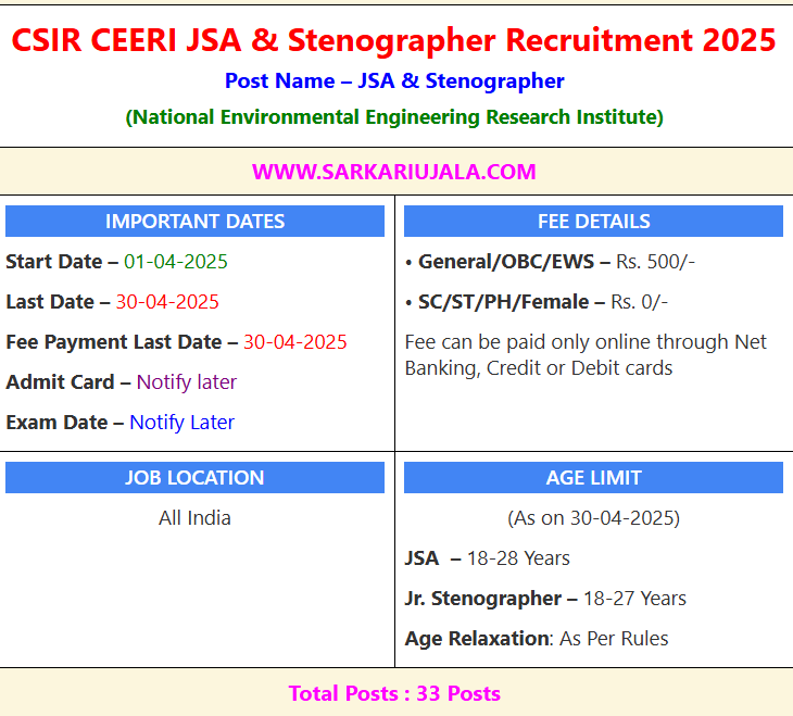 CSIR CEERI JSA & Stenographer Recruitment 2025Post Name – JSA & Stenographer(National Environmental Engineering Research Institute) | |||||