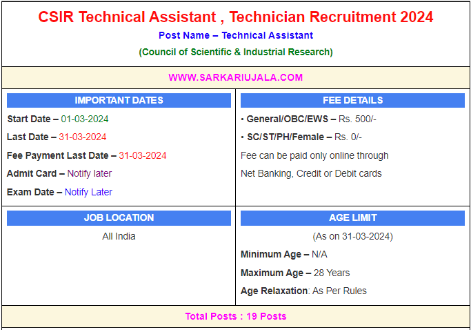 Post Description – Council of Scientific & Industrial Research is inviting online applications for Technical Assistant for 19 posts. Interested people meet all the eligibility criteria, apply online Details Of Recruitment Of CSIR Technical Assistant , Technician Online Form 2024Posts Name –Technical Assistant & Technician Number Of Posts – 19 Posts Category Wise Posts – Technical Assistant – 08 Posts Technician(1) – 11 Posts Pay Scale – Technical Assistant – Rs. 63,312/- Technician(1) – Rs. 34,625/- Education Qualification – Technical Assistant – B.Sc./ Diploma in Related Field Technician(1) – 10th Pass with 55% Marks + ITI in Related Field How to Apply Online CSIR Technical Assistant , Technician Online Form 2024 – Candidates can apply through link provided below or they can also apply through official site of the Indian Institute of Toxicology Research (IITR), Lucknow before 31/March/2024. Required Documents For Online Application – Educational Mark sheet And Certificates Aadhar Card / Pan Card Passport Size Photo Signature Selection Mode – OMR Exam Final Merit List