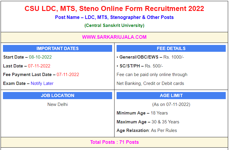 CSU LDC, MTS, Steno Online Form Recruitment 2022Post Name – LDC, MTS, Stenographer & Other Posts(Central Sanskrit University) | |||||
