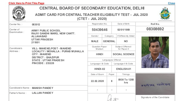 CTET July 2020 Admit Card | |||||