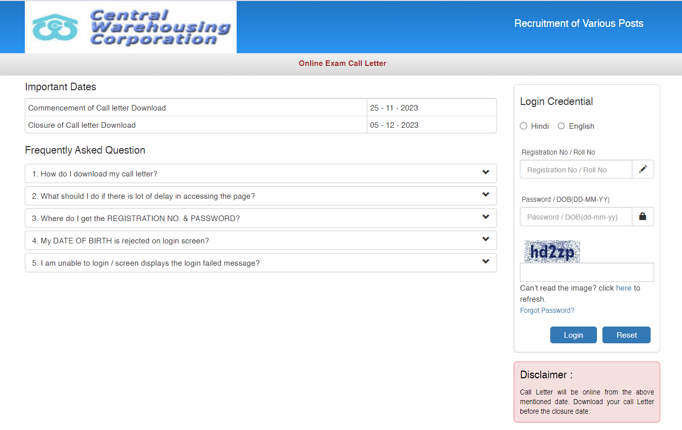 CWC Various Post Admit Card 2023Post Name – Junior Technical Assistant & Other Various Post(Central Warehousing Corporation) | |||||