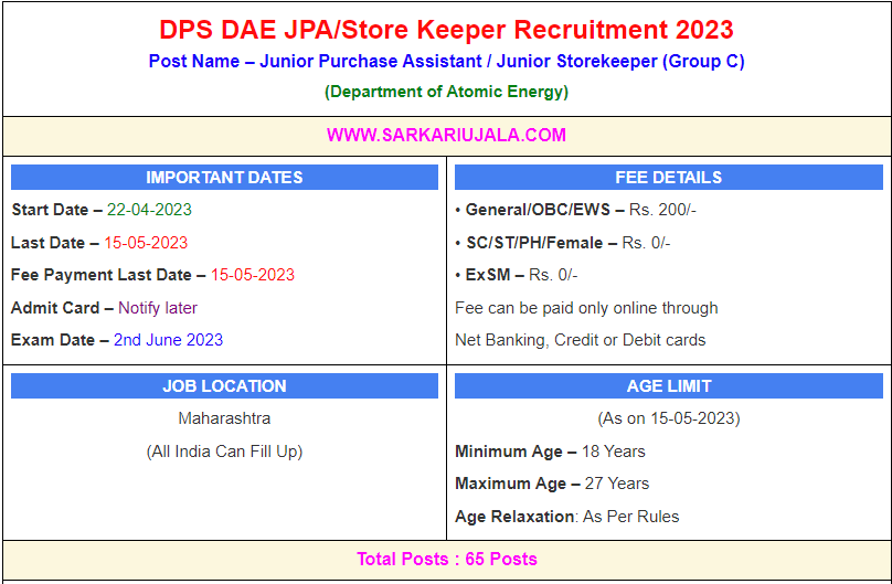 Post Description – DAE Department of Atomic Energy is inviting online applications for Junior Purchase Assistant / Junior Storekeeper for 65 posts. Interested people meet all the eligibility criteria, apply online Details Of Recruitment Of DPS DAE JPA/Store Keeper Online Form 2023Posts Name – Junior Purchase Assistant / Junior Storekeeper Number Of Posts – 65 Posts Category Wise Posts – General – 12 Posts EWS – 22 Posts OBC – 8 Posts SC – 23 Posts ST– 0 Posts Pay Scale – Level 4 (Rs. 25500- 81100) Education Qualification – Graduation in Science with 60% marks OR Commerce Graduate with 60% marks OR Diploma in Mechanical/ Electrical/ Electronics/ Computer Science Engineering with 60% marks How to Apply Online DAE JPA/Store Keeper Online Form 2023 – Candidates can apply through link provided below or they can also apply through official site of the Department of Atomic Energy before 15/May/2023. Required Documents For Online Application – Educational Mark sheet And Certificates Aadhar Card / Pan Card Passport Size Photo Signature Selection Mode – Written Exam Merit List