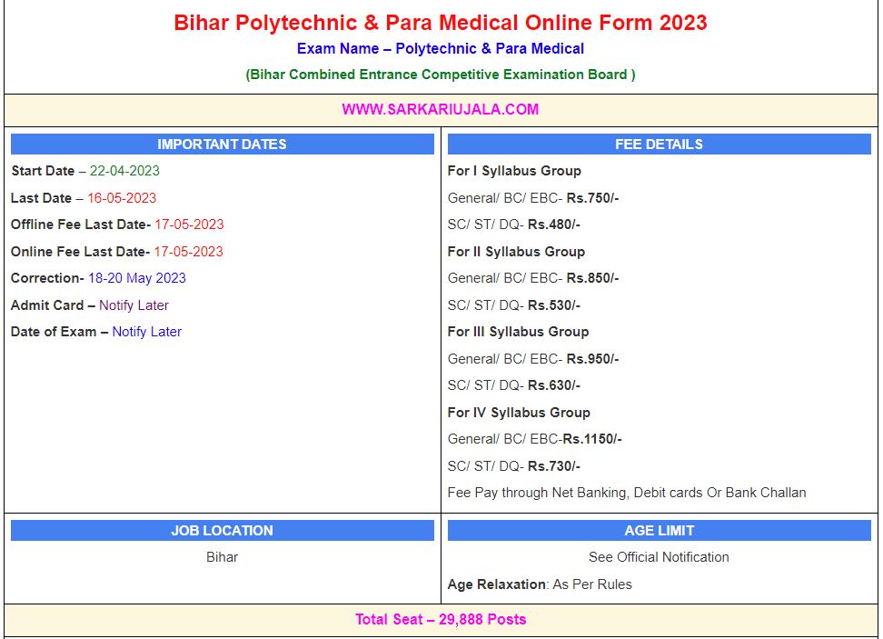 Bihar Polytechnic & Para Medical Online Form 2023Exam Name – Polytechnic & Para Medical(Bihar Combined Entrance Competitive Examination Board ) | |||||
