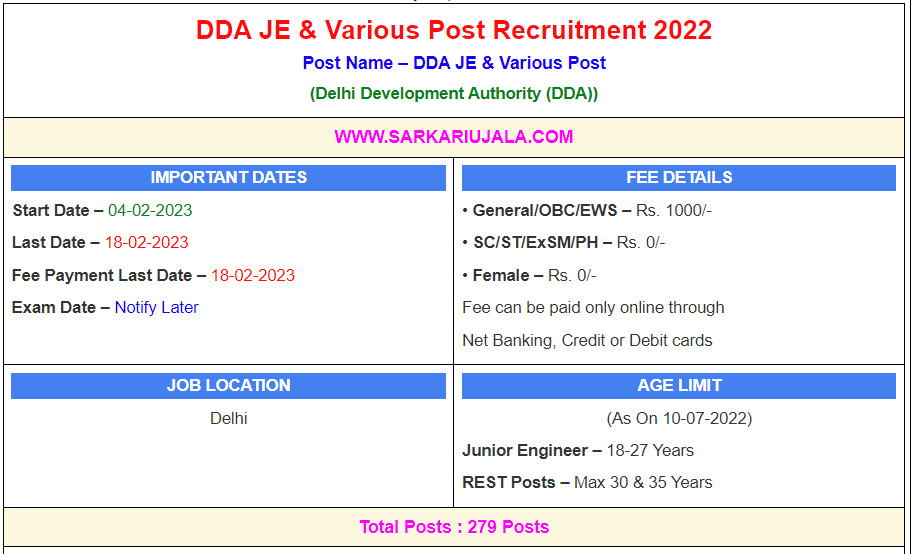 DDA JE & Various Post Recruitment 2022Post Name – DDA JE & Various Post(Delhi Development Authority (DDA)) | |||||