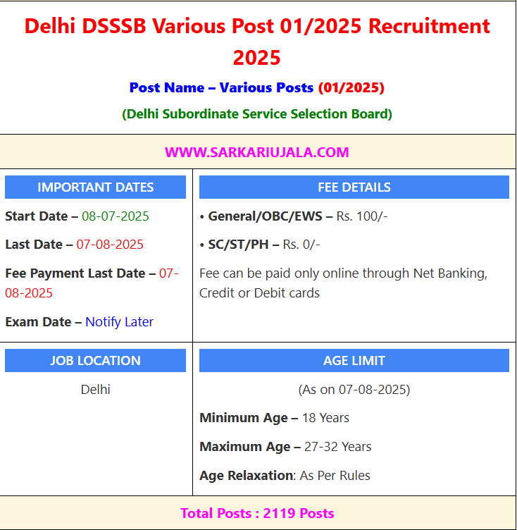 Post Description – Delhi Subordinate Service Selection Board (DSSSB) Has Been Inviting Online Application For 2119 Posts . Eligible Candidates Can Apply Online From Official Website. Details Of Recruitment Of Delhi DSSSB Various Post 01/2025 Online Form :Posts Name – Various Posts Number Of Posts – 2119 Posts Category Wise Posts –