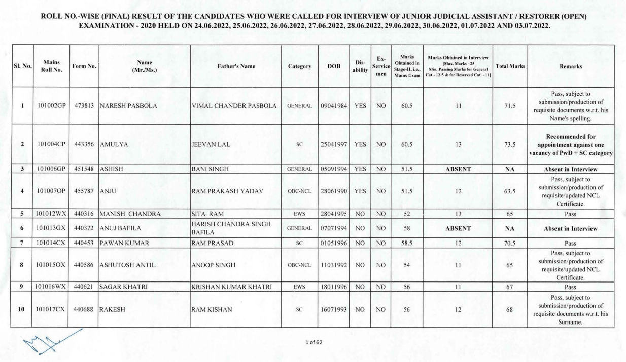 Delhi High Court JJA/ Restorer Result 2020Exam Name – Delhi High Court JJA/ Restorer(High Court of Delhi) | |||||