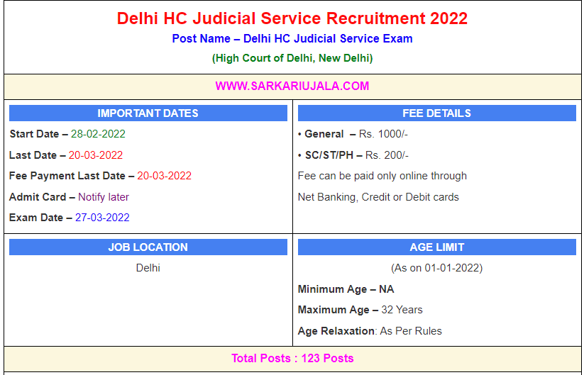 Post Description – High Court of Delhi, New Delhi is inviting online applications for Delhi HC Judicial Service Exam for 123 posts. Interested people meet all the eligibility criteria, apply online Details Of Recruitment Of Delhi HC Judicial Service Online Form 2022Posts Name – Delhi HC Judicial Service Exam Number Of Posts – 123 Posts Category Wise Posts – General – 86 Posts SC – 08 Posts ST – 29 Posts Pay Scale – Rs.56100 – 177500/- (Level 10th) Education Qualification – Bachelor Degree in Law & Practicing As a Advocate How to Apply Online Delhi HC Judicial Service Online Form 2022 – Candidates can apply through link provided below or they can also apply through official site of the High Court of Delhi, New Delhi before 20/March/2022. Required Documents For Online Application – Educational Mark sheet And Certificates Aadhar Card / Pan Card Passport Size Photo Signature Selection Mode – Written Examination Final Merit List