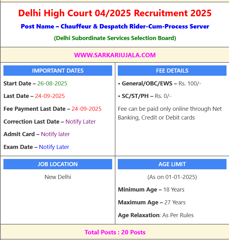 Post Description – Delhi Subordinate Service Selection Board is inviting online applications for Attendant for 20 posts. Interested people meet all the eligibility criteria, apply online Details Of Recruitment Of Delhi High Court 04/2025 Online Form Posts Name – Chauffeur & Despatch Rider-Cum-Process Server Number Of Posts – 20 Posts Category Wise Posts – Chauffeur – 08 Posts Despatch Rider Cum Process Server – 12 Posts Pay Scale – Level 5 Education Qualification – Chauffeur – Matric / Higher Secondary with driving license of light motor vehicles. And 2 years unblemished experience in the line. Despatch Rider Cum Process Server – Matric / Higher Secondary with Driving License of light motor vehicles/ motor cycle. And 2 years unblemished driving experience. How to Apply Online Delhi High Court 04/2025 Online Form – Candidates can apply through link provided below or they can also apply through official site of the Delhi Subordinate Services Selection Board before 24/September/2025. Required Documents For Online Application – Educational Mark sheet And Certificates Aadhar Card / Pan Card Passport Size Photo Signature Selection Mode – CBT Exam Interview Merit List